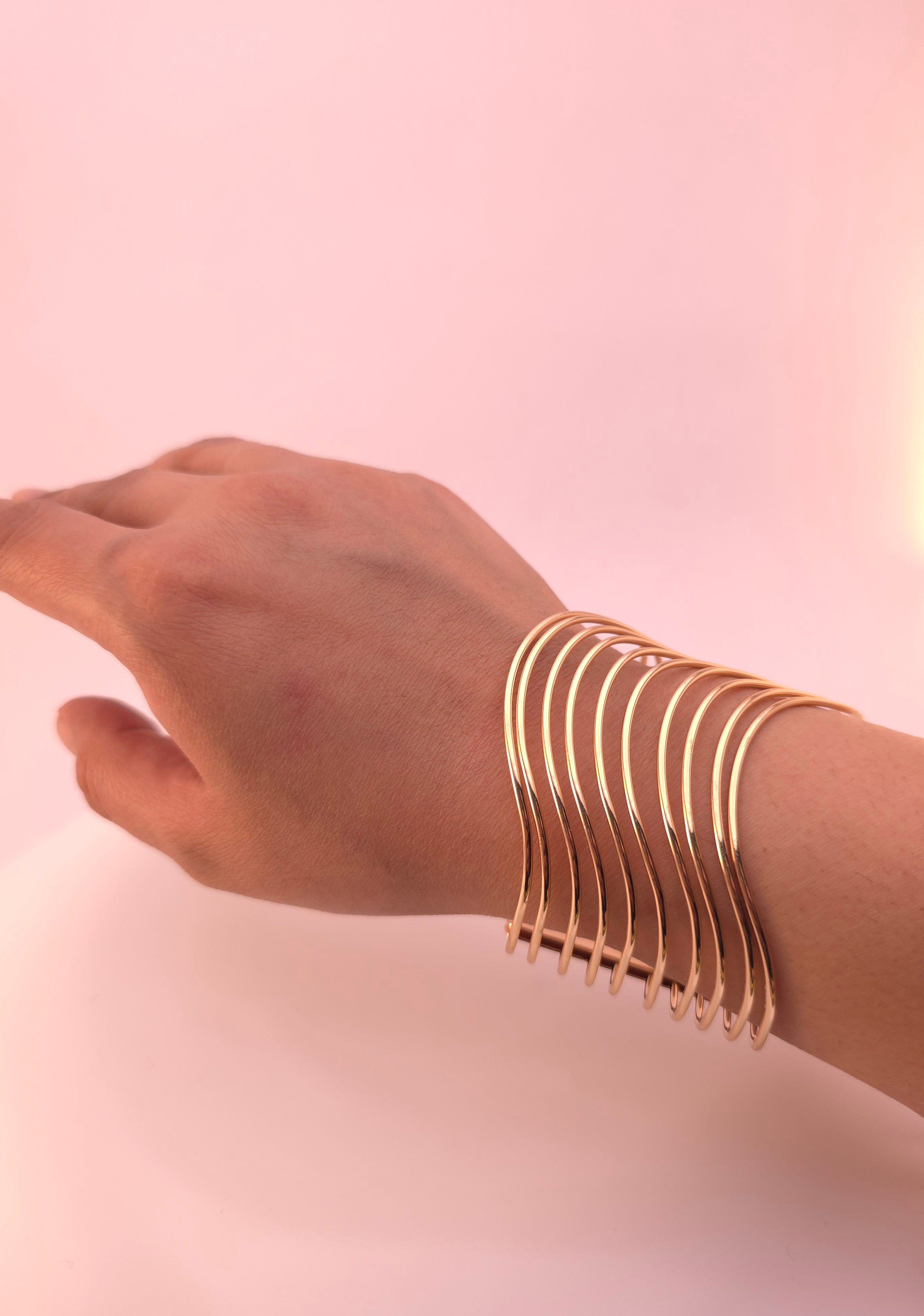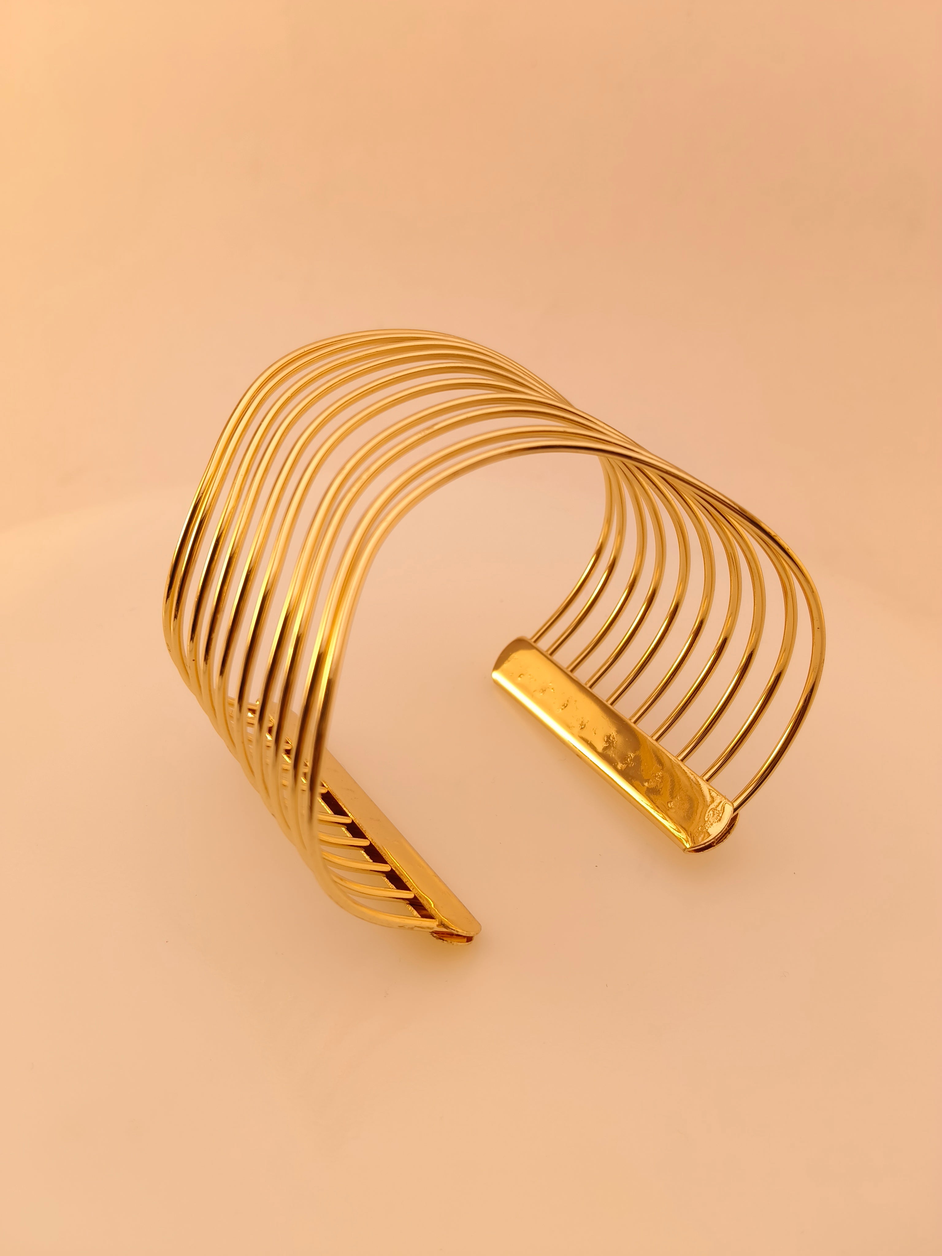 This gold wave-style cuff bracelet features a flowing multi-line design with a sleek high-polish finish. The open cuff structure is lightweight, comfortable, and easy to wear, creating a modern statement look. Perfect for parties, festive occasions, or elegant everyday styling, it adds a graceful touch to any outfit.
