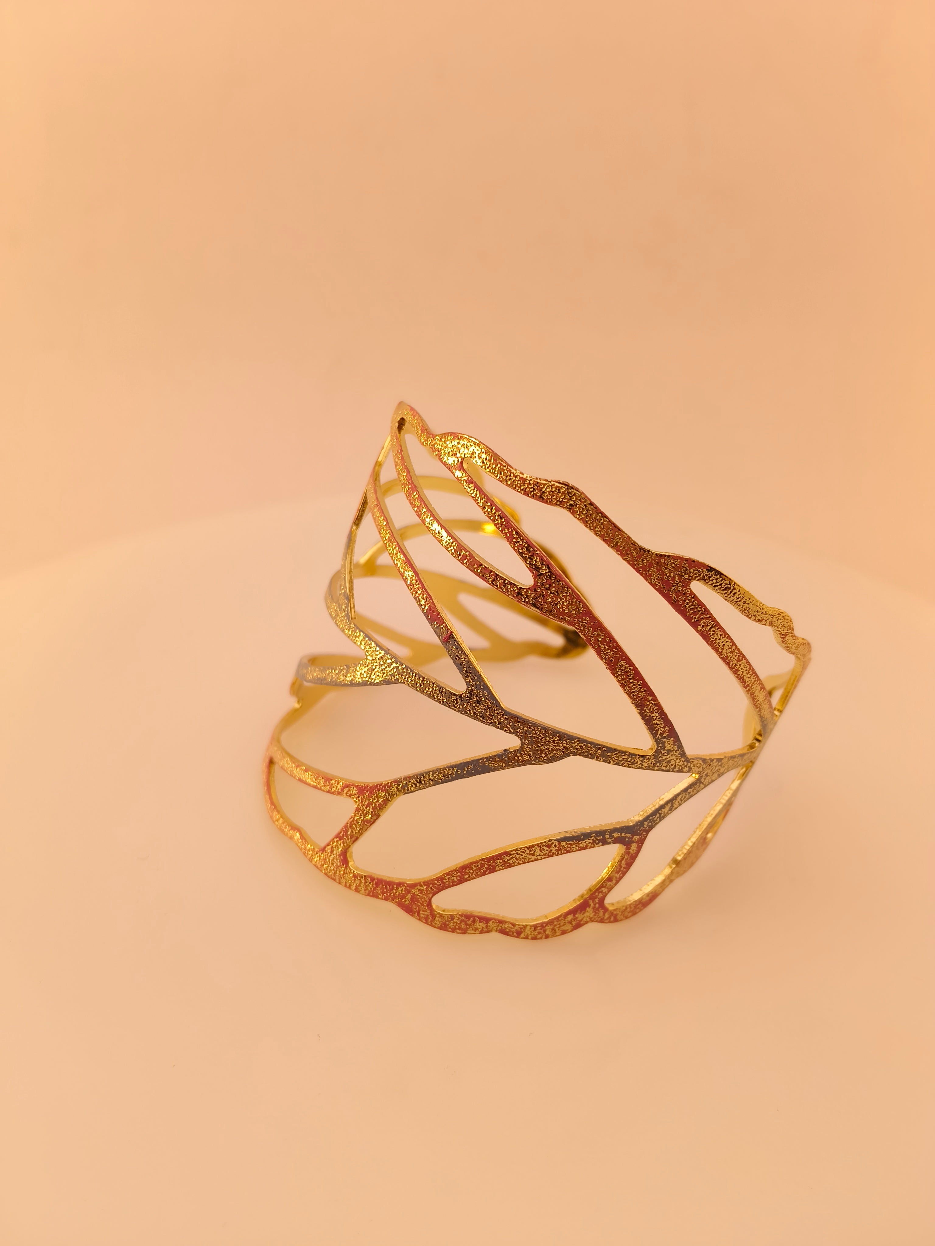 This gold abstract cuff bracelet features a unique leaf-inspired openwork design with a textured, shimmering finish. Its artistic flowing pattern gives a modern yet elegant look, while the open cuff style ensures a comfortable and lightweight fit. Perfect for parties, festive occasions, or statement styling, this bracelet adds a bold touch of sophistication to any outfit.